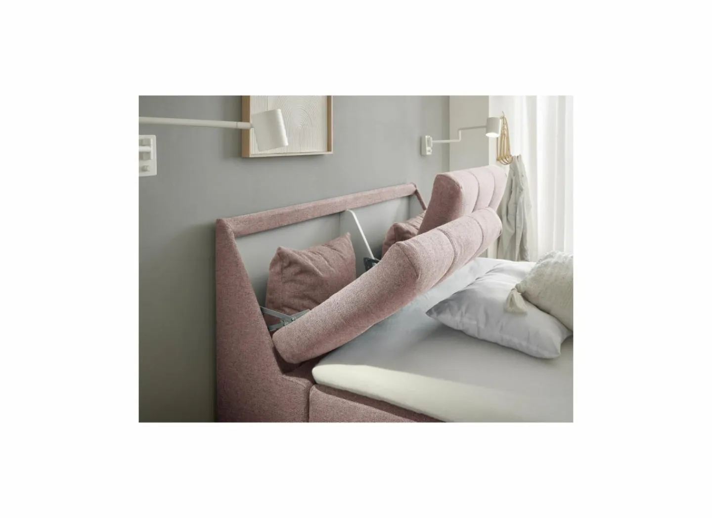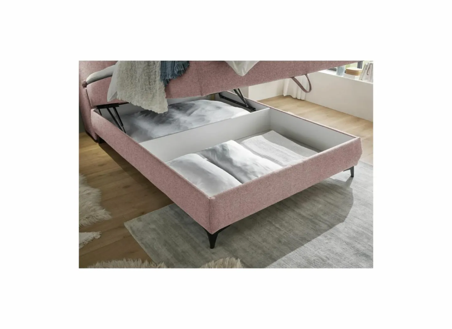 De bedbox heeft drie opbergruimtes: één aan de achterkant onder de matras en twee aan het hoofdeinde die opengeklapt kunnen worden.