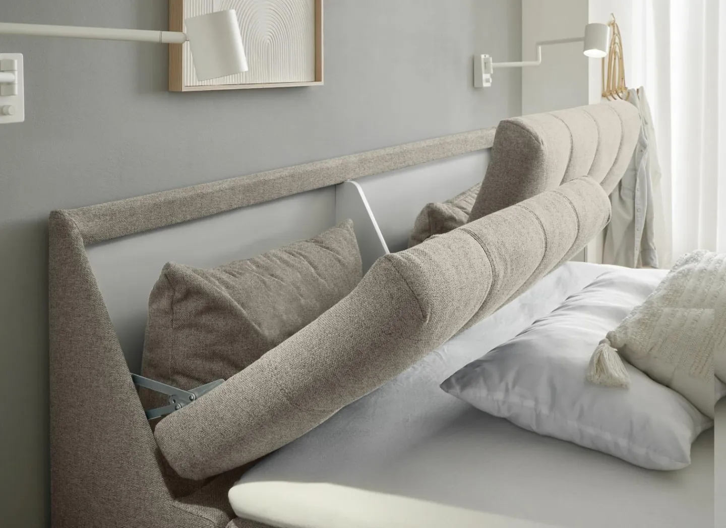 De bedbox heeft 4 opbergruimtes: 2 aan de zijkant onder de matras en 2 aan het hoofdeinde die opengeklapt kunnen worden.
