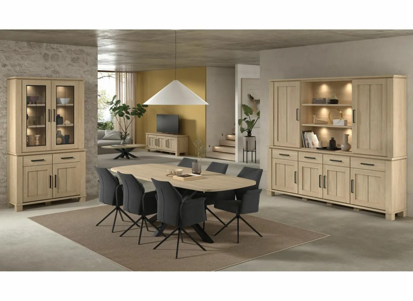 Eetkamer Como 2 met 4 stoelen Epoca beige – tafel 170x95cm – dressoir 170cm – bergkast 120cm