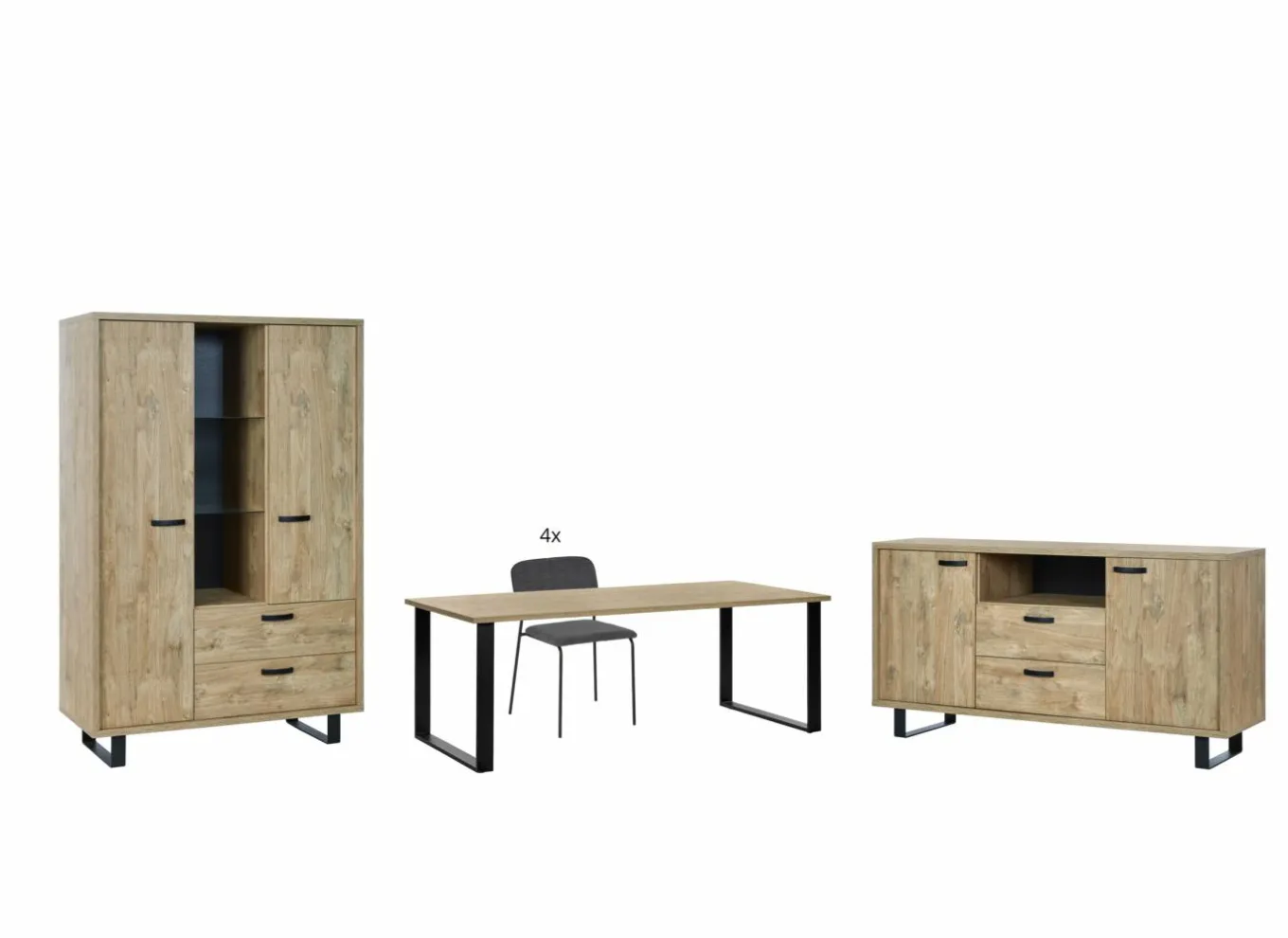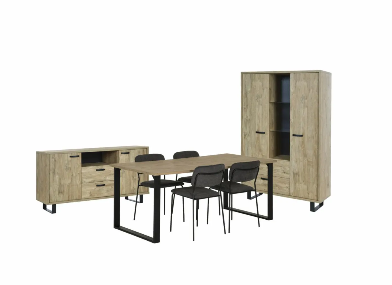Eetkamer Cronos decor eik met 4 stoelen Crux – tafel 210x100cm – dressoir 218cm – kast 130cm
