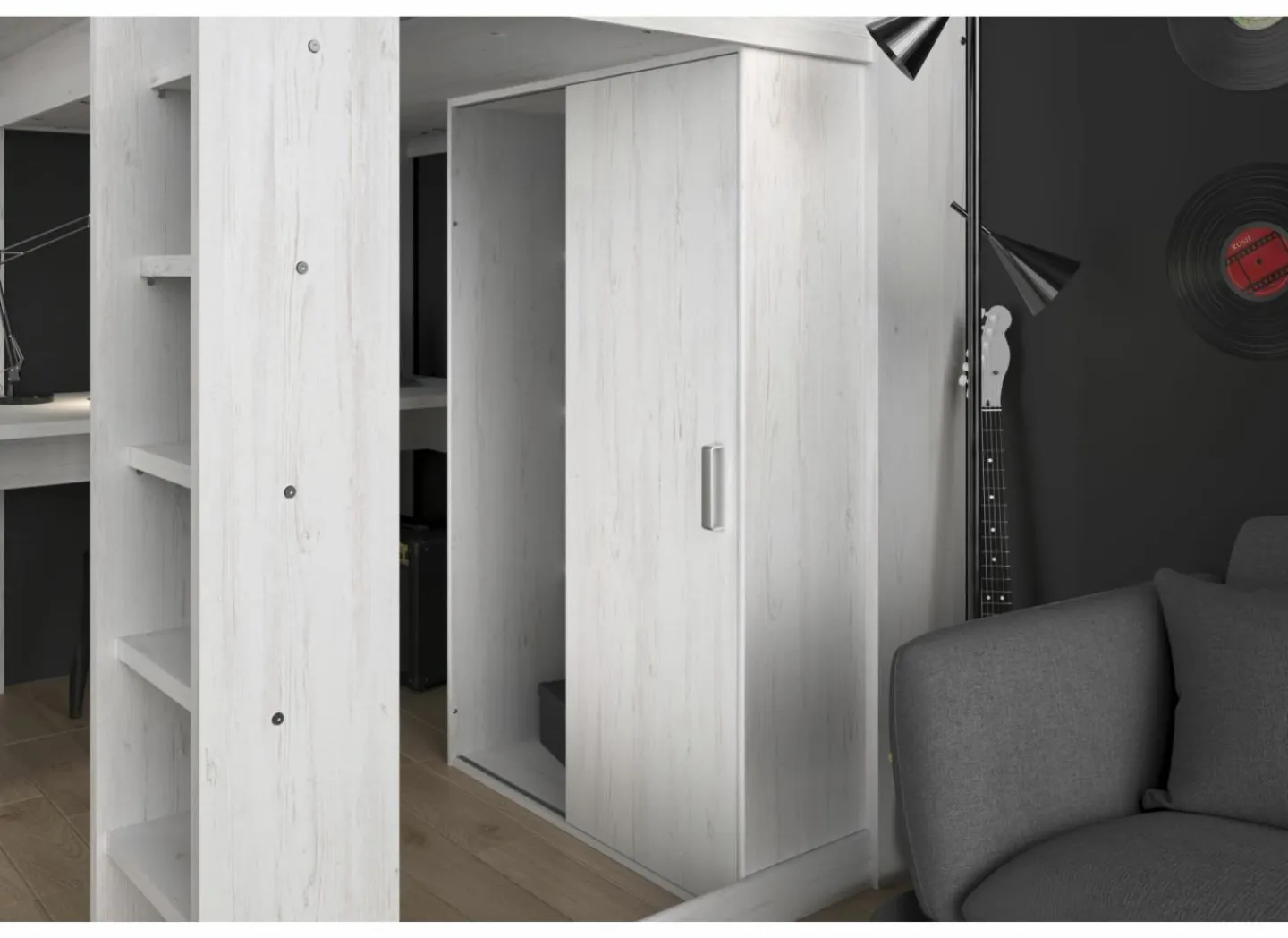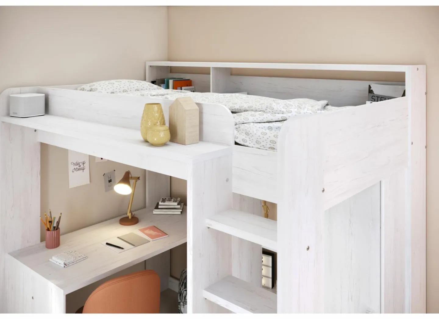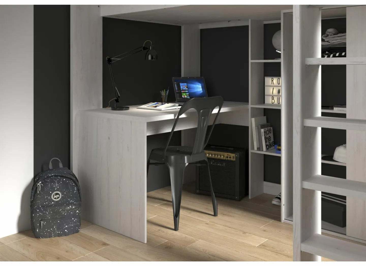 Het royale bureaublad heeft een afmeting van 133×67 cm. Achter de trap een kledingkast met 1 schuifdeur en 2 vakken, één van 130 cm hoog, 47 cm breed en 50 cm diep met een kledingroede, het andere vak heeft 3 legplanken.