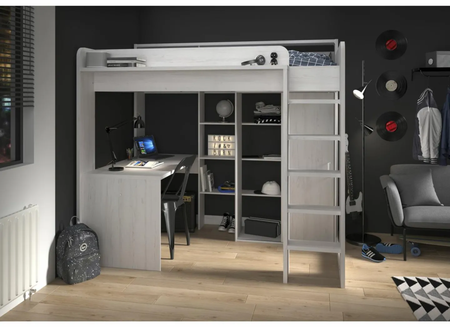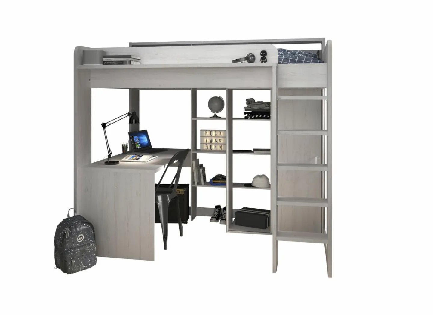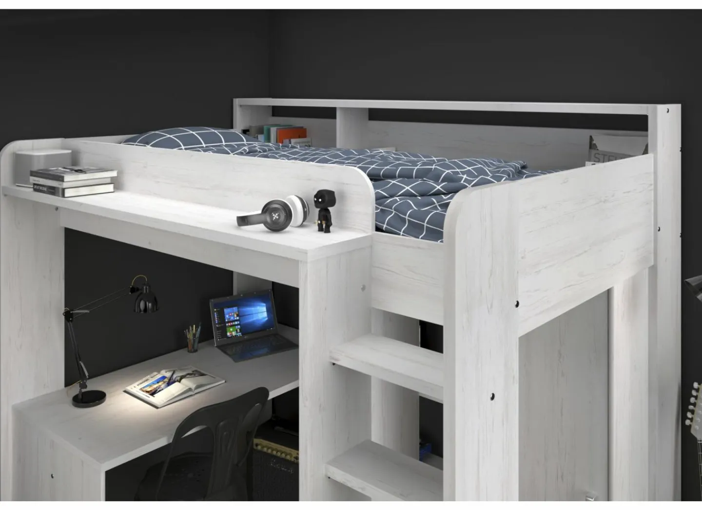Het royale bureaublad heeft een afmeting van 133×67 cm. Achter de trap een kledingkast met 1 schuifdeur en 2 vakken, één van 130 cm hoog, 47 cm breed en 50 cm diep met een kledingroede, het andere vak heeft 3 legplanken.