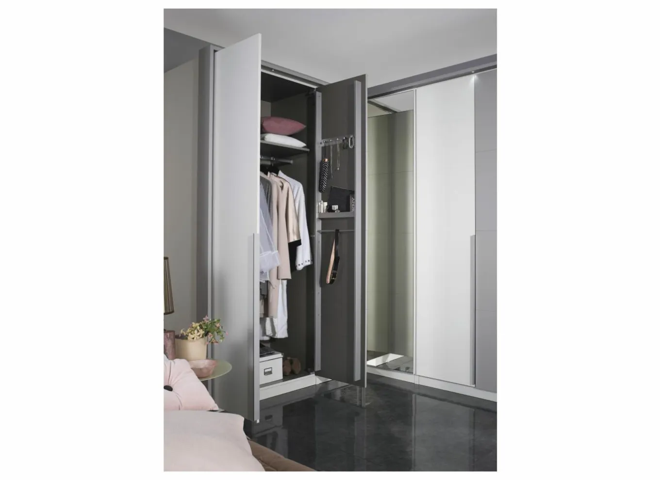 Deze kast bevat een ladenblok (met 3 laden), hang/leg-indeling, legboorden en een binnendeurrek.