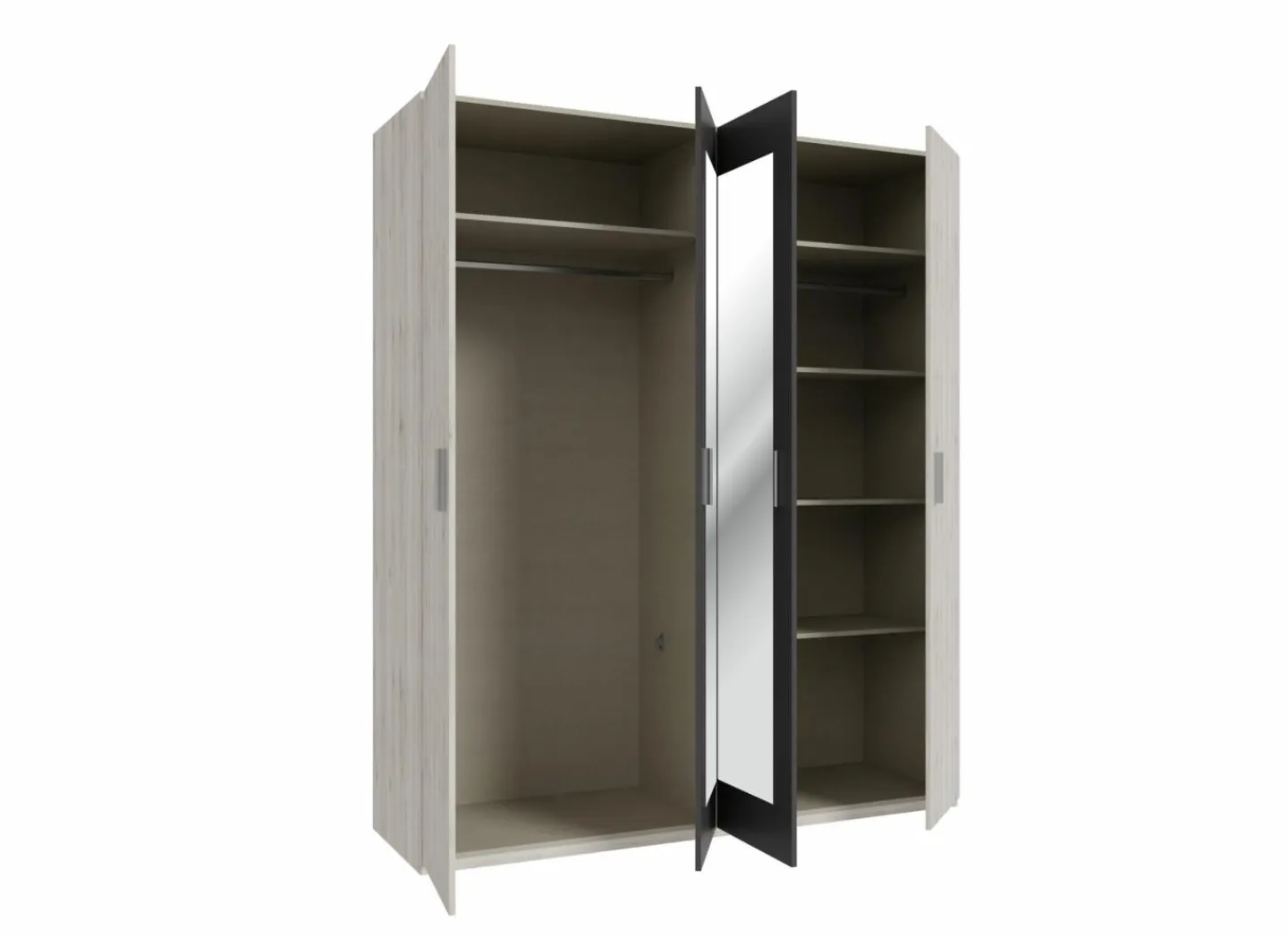 Deze Adria kast biedt een perfecte balans tussen functionaliteit en stijl. Met vier deuren, waarvan twee voorzien van spiegels, combineert deze kast opbergruimte met een ruimtelijk effect in de kamer. De binnenkant is praktisch ingedeeld: een hanggedeelte aan de ene kant en ruime legplanken aan de andere, zodat u uw kleding en accessoires netjes kunt organiseren. De zand eiken afwerking in combinatie met wolframgrijs geeft een moderne en tijdloze uitstraling. Dankzij de stevige constructie en hoogwaardige materialen is deze kast ontworpen voor jarenlang gebruik. De montage is eenvoudig met de bijgeleverde instructies, zodat u snel kunt genieten van een opgeruimde en stijlvolle slaapkamer.