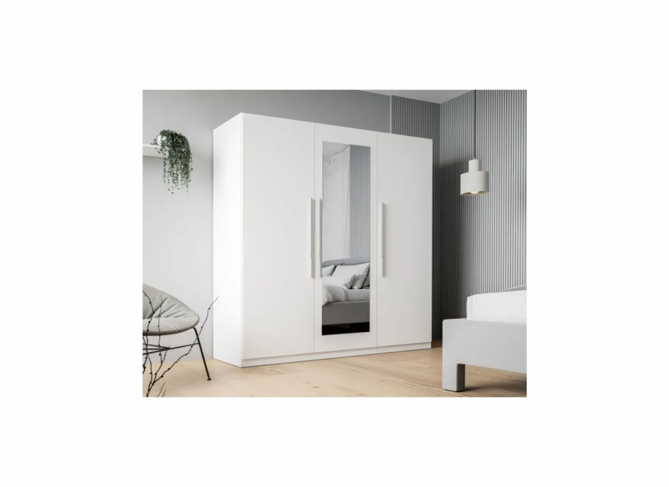 Deze ruime 3-deurs kledingkast combineert stijl en functionaliteit in één. De kast heeft twee vakken met een kledingroede voor hangkleding en een vak met legplanken, ideaal voor opgevouwen kleding of accessoires. De centrale spiegeldeur voegt extra praktisch gemak toe en laat de ruimte groter lijken. De kast is gemaakt van stevige meubelplaat met een wit decor, wat zorgt voor een moderne uitstraling en een onderhoudsvriendelijk oppervlak. Dankzij de solide constructie biedt deze kast stabiliteit en duurzaamheid voor jarenlang gebruik.