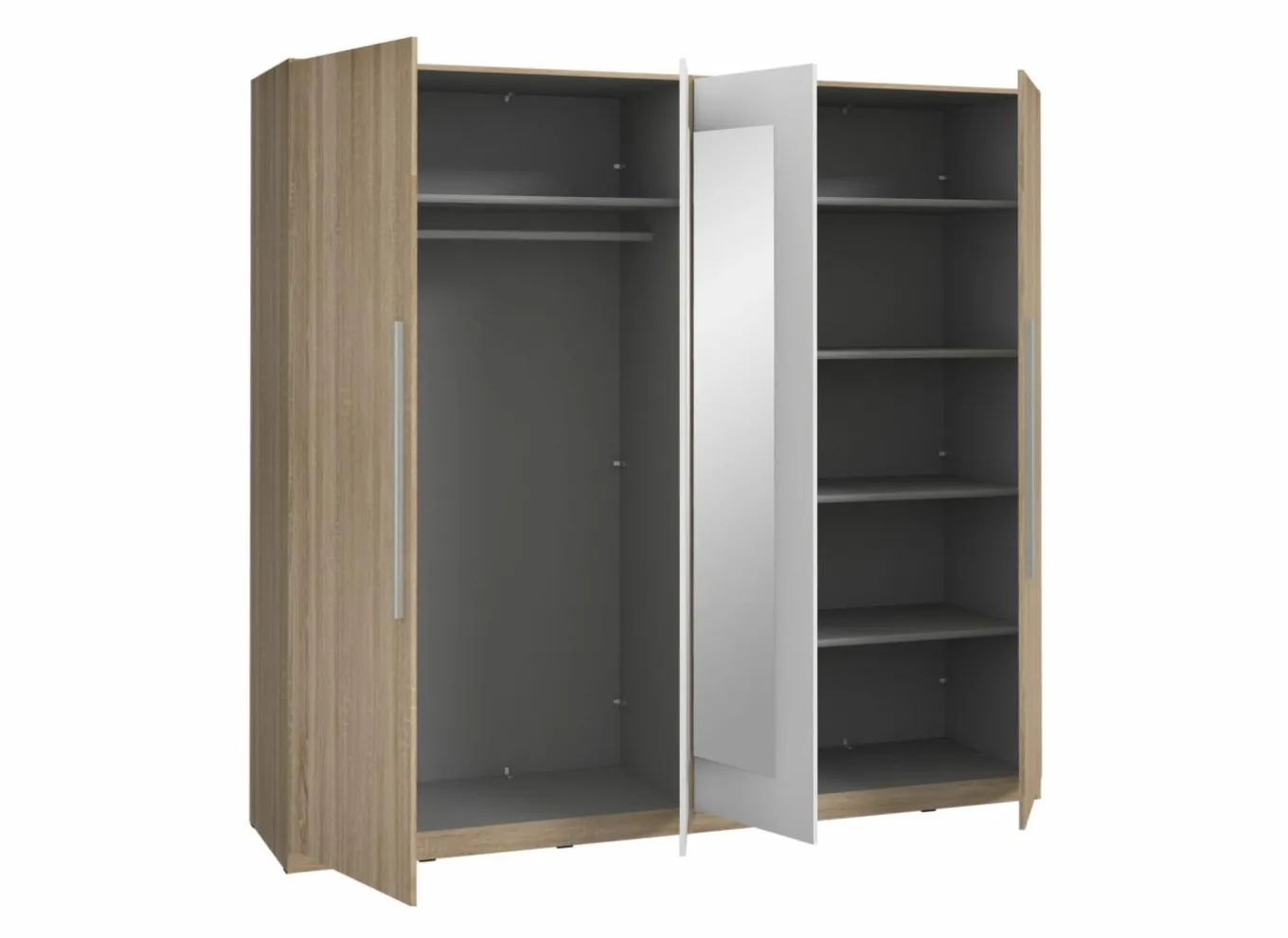 Deze 4-deurs kledingkast combineert een half hang- en half leggedeelte, waardoor u uw kleding overzichtelijk kunt opbergen. De twee centrale spiegeldeuren bieden extra gemak en laten de ruimte groter lijken. Dankzij de warme Sonoma eik afwerking met witte accenten straalt de kast moderniteit en elegantie uit. De constructie in stevige meubelplaat zorgt voor stabiliteit en langdurig gebruik, terwijl de ruime afmetingen voldoende opbergruimte bieden.
