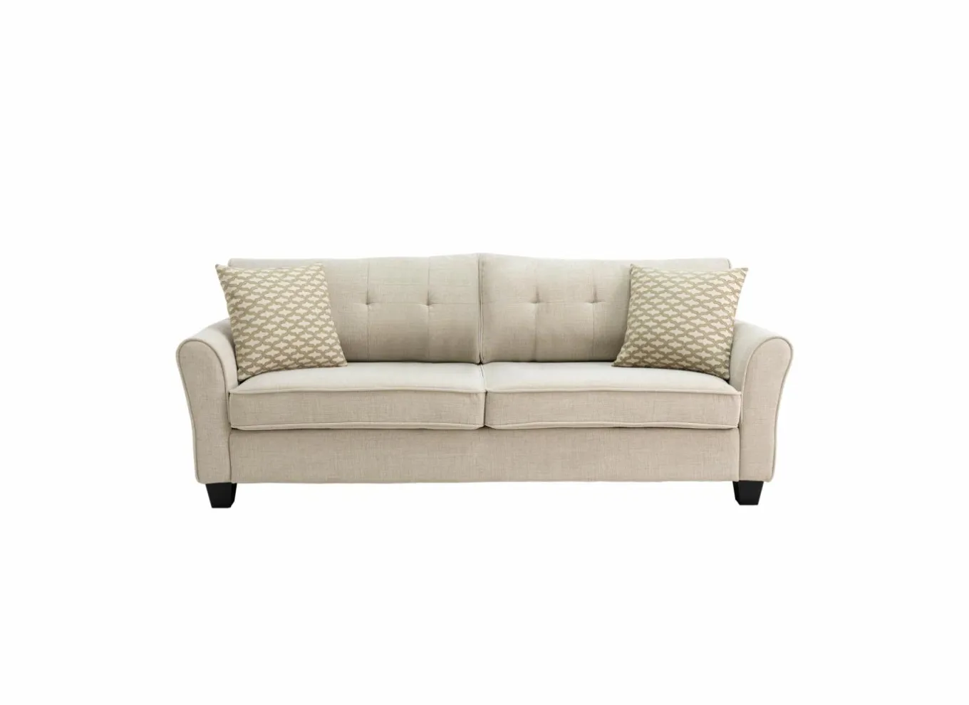 Bekleed met een zachte en duurzame stof in een combinatie van polyester en katoen, komt de sofa tot leven in een elegante beige kleur die rust en harmonie brengt in elk interieur. De afgeronde vormen geven het ontwerp een vriendelijke en toegankelijke look, terwijl het zitcomfort centraal staat.