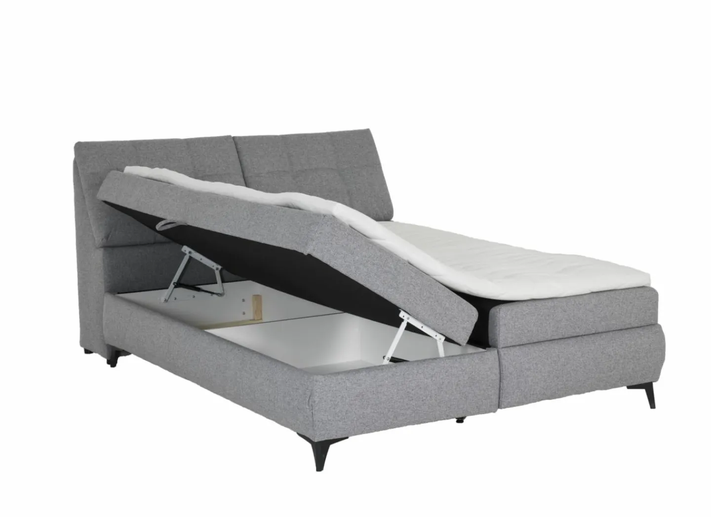 De bedbox heeft 4 opbergruimtes: 2 aan de zijkant onder de matras en 2 aan het hoofdeinde die opengeklapt kunnen worden.