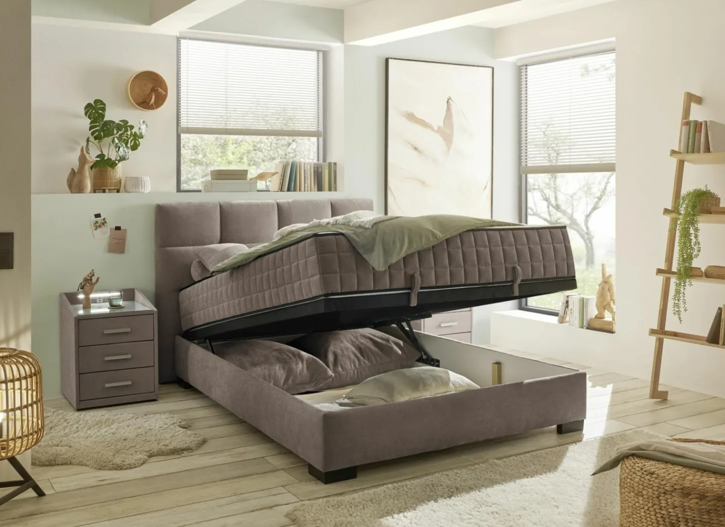 De bedbox heeft 1 opbergruimte, een hoofdbord van 114 cm en een lighoogte van 59 cm.