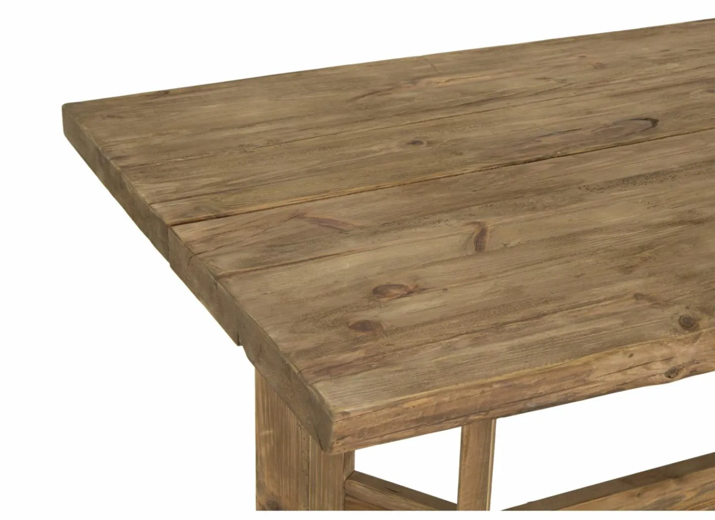 De tafel is vervaardigd uit massief gerecycled dennenhout, waardoor elk exemplaar uniek is en voorzien van een authentiek karakter. De natuurlijke bruine afwerking benadrukt de stoere uitstraling van het hout, terwijl de stevige houten poten zorgen voor stabiliteit en duurzaamheid.