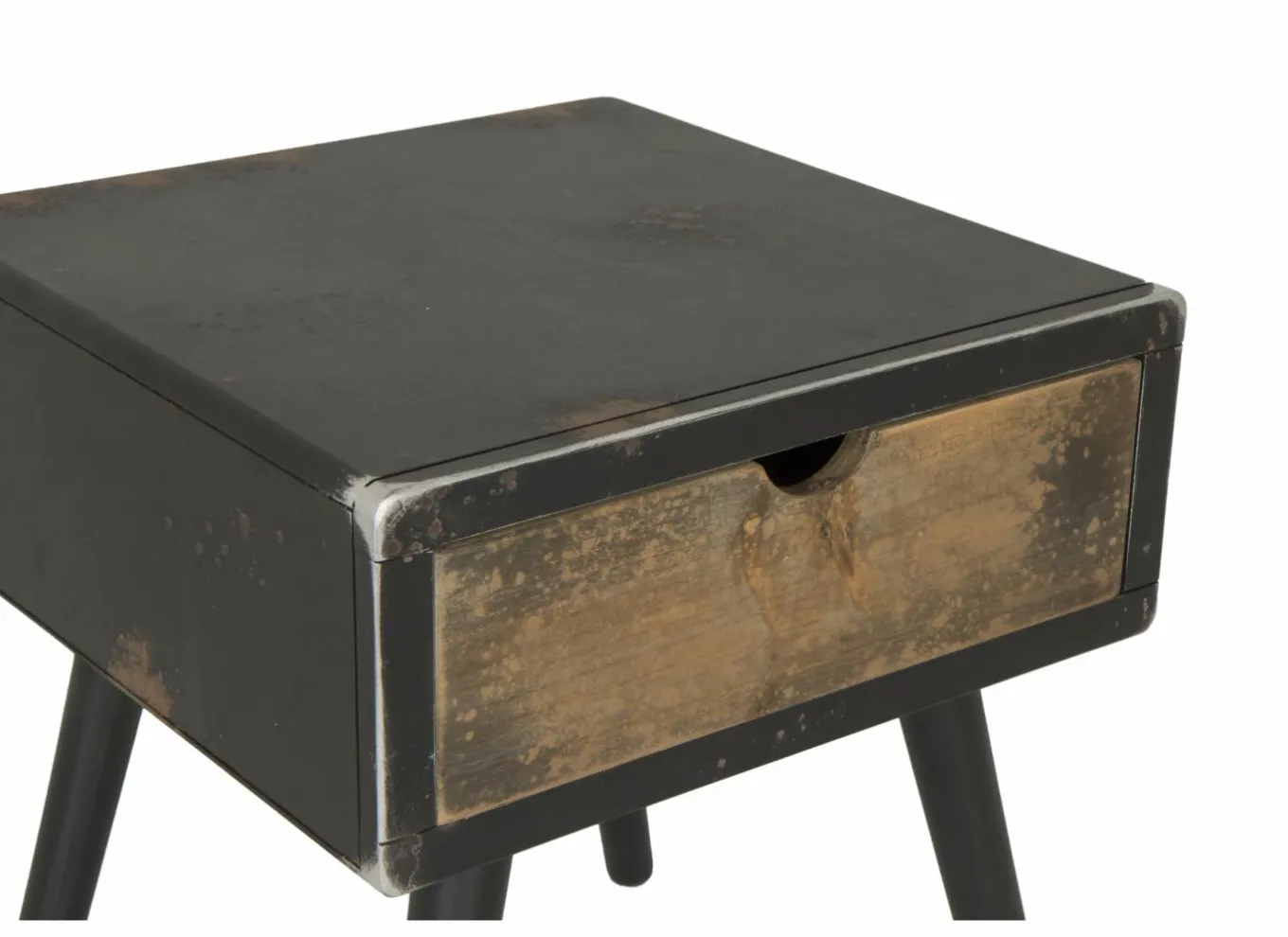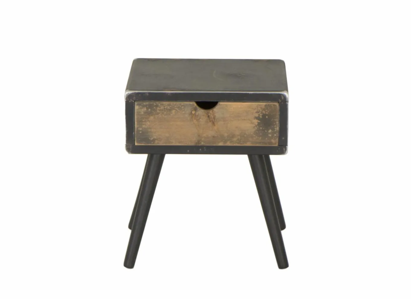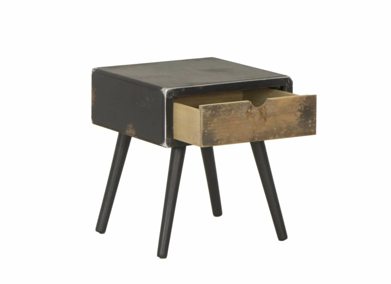 Het meubel is vervaardigd uit massief dennenhout en MDF, afgewerkt in een natuurlijke houtkleur met zwarte details. Deze combinatie geeft het nachtkastje een moderne en toch tijdloze uitstraling, perfect passend in een Scandinavisch, industrieel of landelijk interieur.