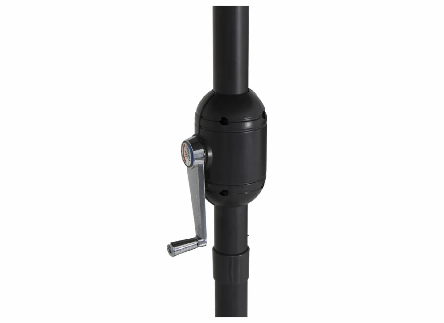 | Opensysteem parasol | Zwengel Een zwengel is een heel eenvoudig systeem. Door aan de zwengel te draaien open of sluit je de staande of zweefparasol. |